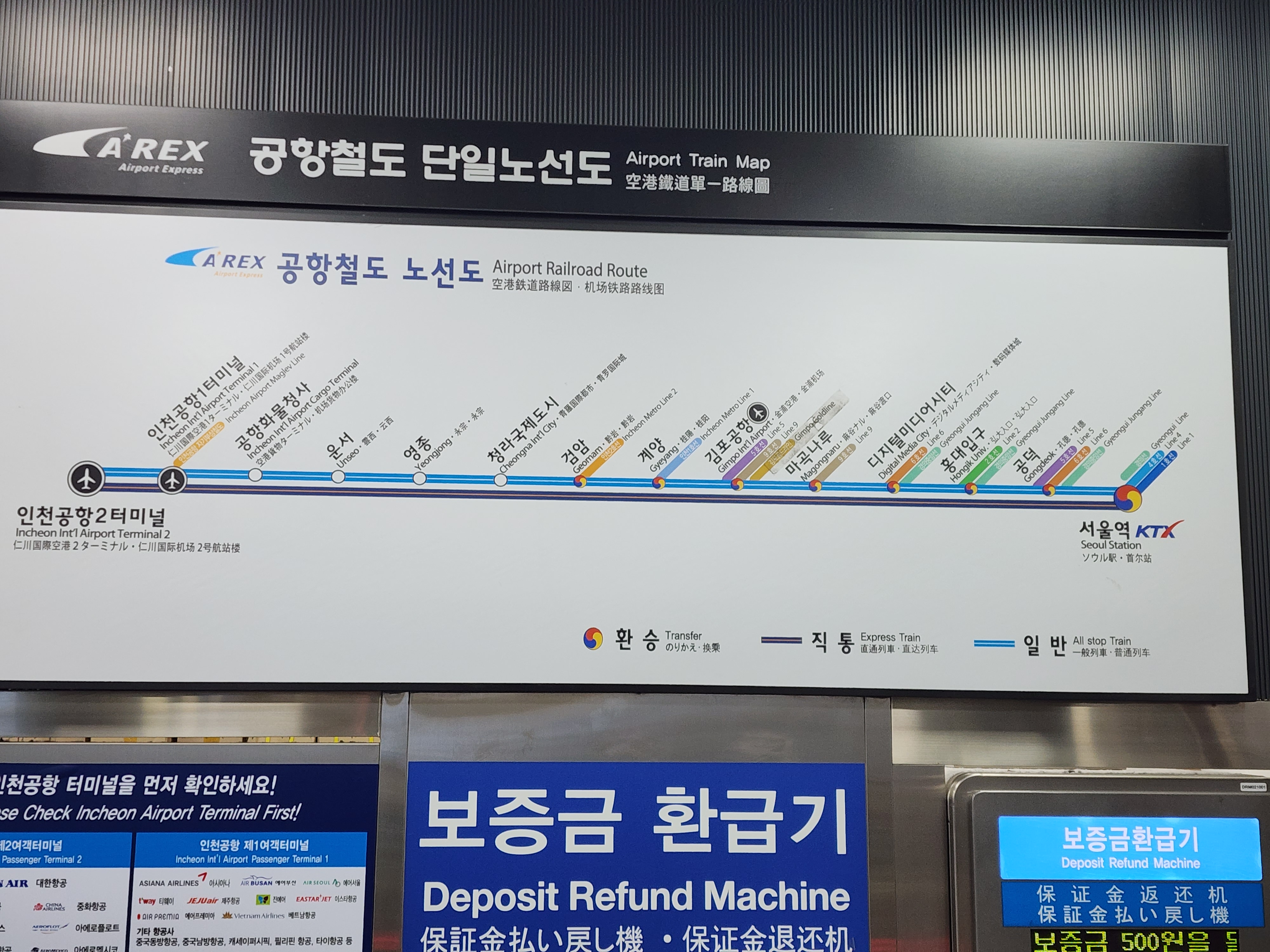 그리고 인천국제공항 방면 일반열차는 서울역을 출발하여 공덕역,홍대입구역,디지털미디어시티역,마곡나루역,김포공항역,계양역,검암역,청라국제도시,영종역,운서역,공항화물청사역,인천공항제1터미널역을 경유하여 인천공항제2터미널 역까지는 약 1시간 6분이 소요된다.