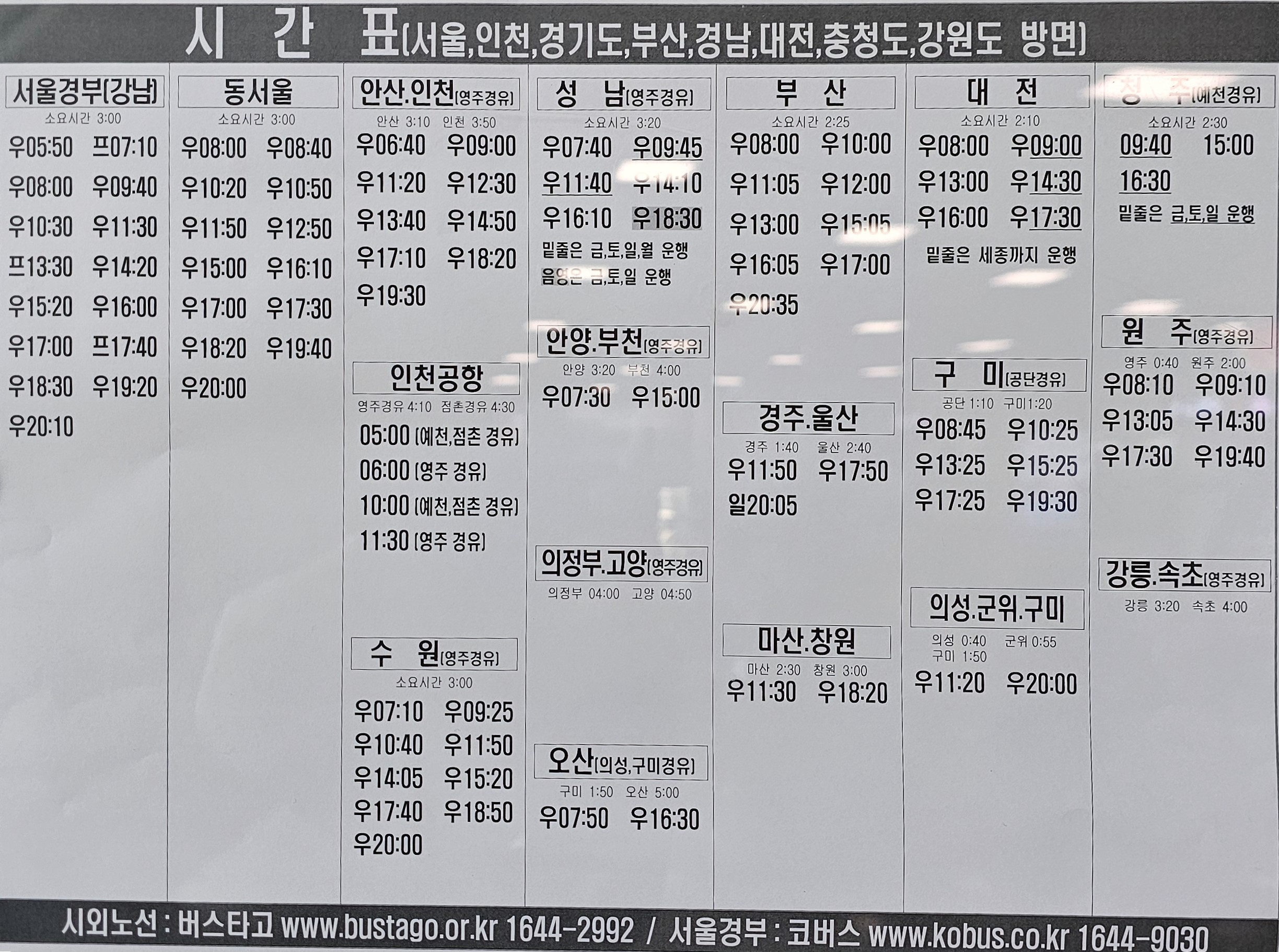 버스 이용시 운수사 사정에 의하여 시간표가 변경 될 수 있기 때문에 버스 이용전에 운행여부를 다시한번 확인 하여야 한다.
