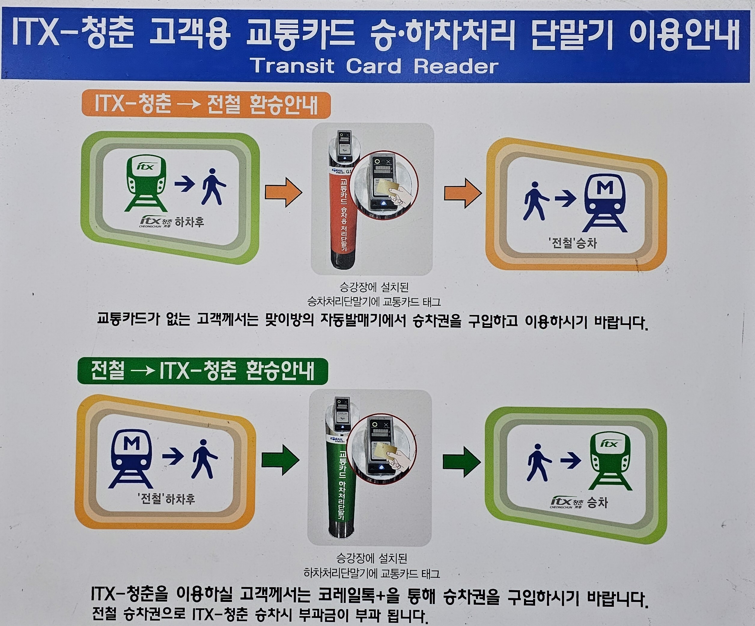 ITX 청춘열차는 교통카드를 이용하여 승차할수 없고 기차 승차권을 소지하고 탑승하여야 한다.