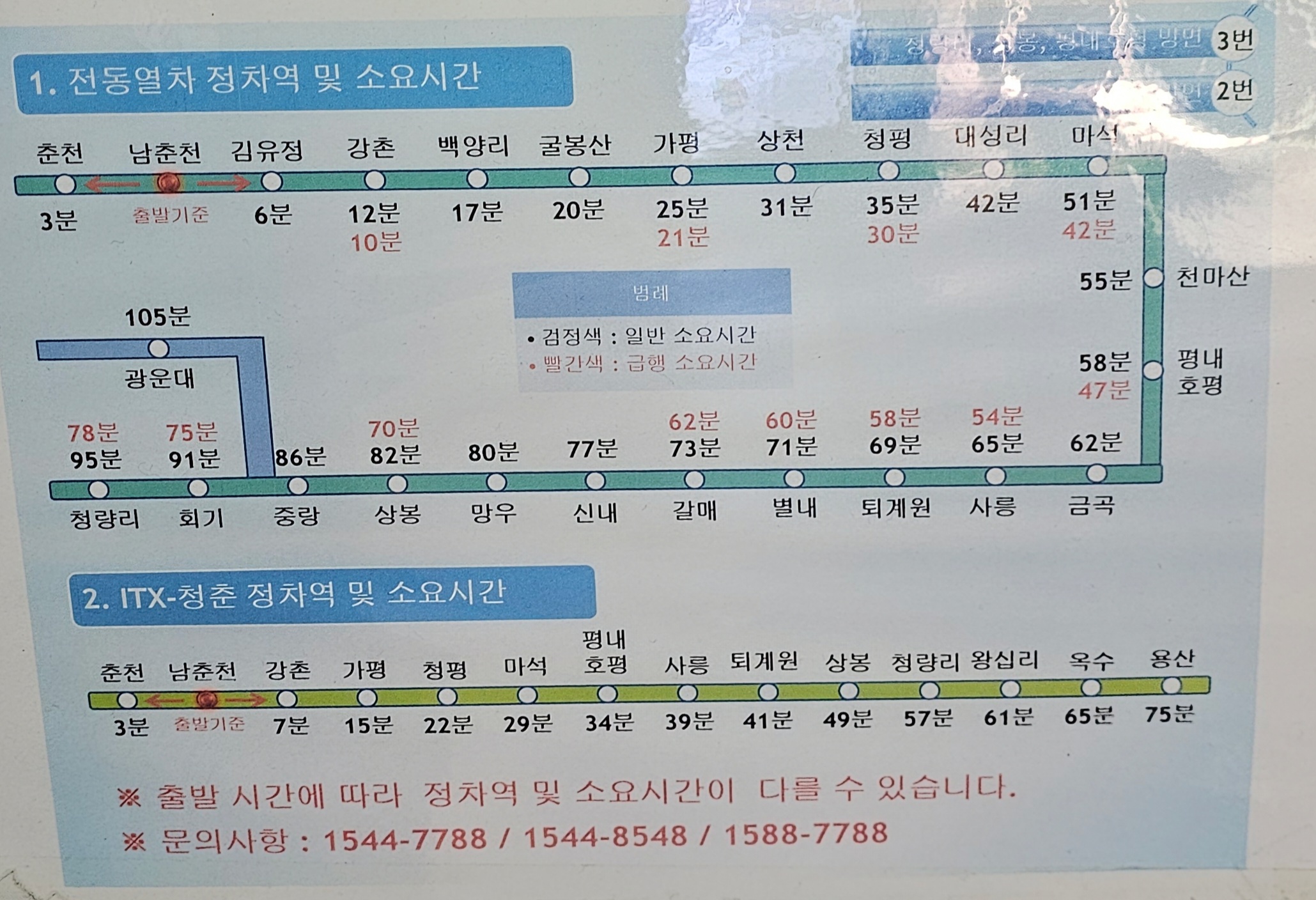 남춘천역에서 춘천역까지 전철 소요시간은 약 3분이고,청량리역까지 급행 전철은 약 78분이고 일반전철은 소요시간이 약 1시간 35분이 소요된다.