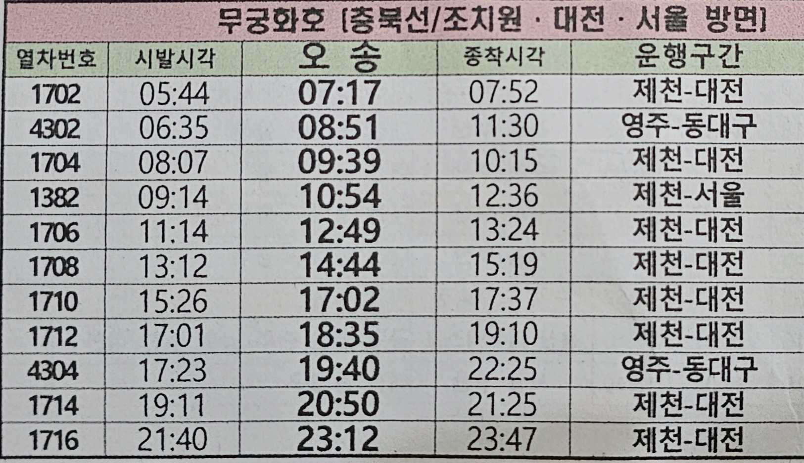 오송역은 충북선 노선의 무궁화호 열차가 제천,대전,영주,동대구,청주공항 방면 등으로 운행되고 있다.
