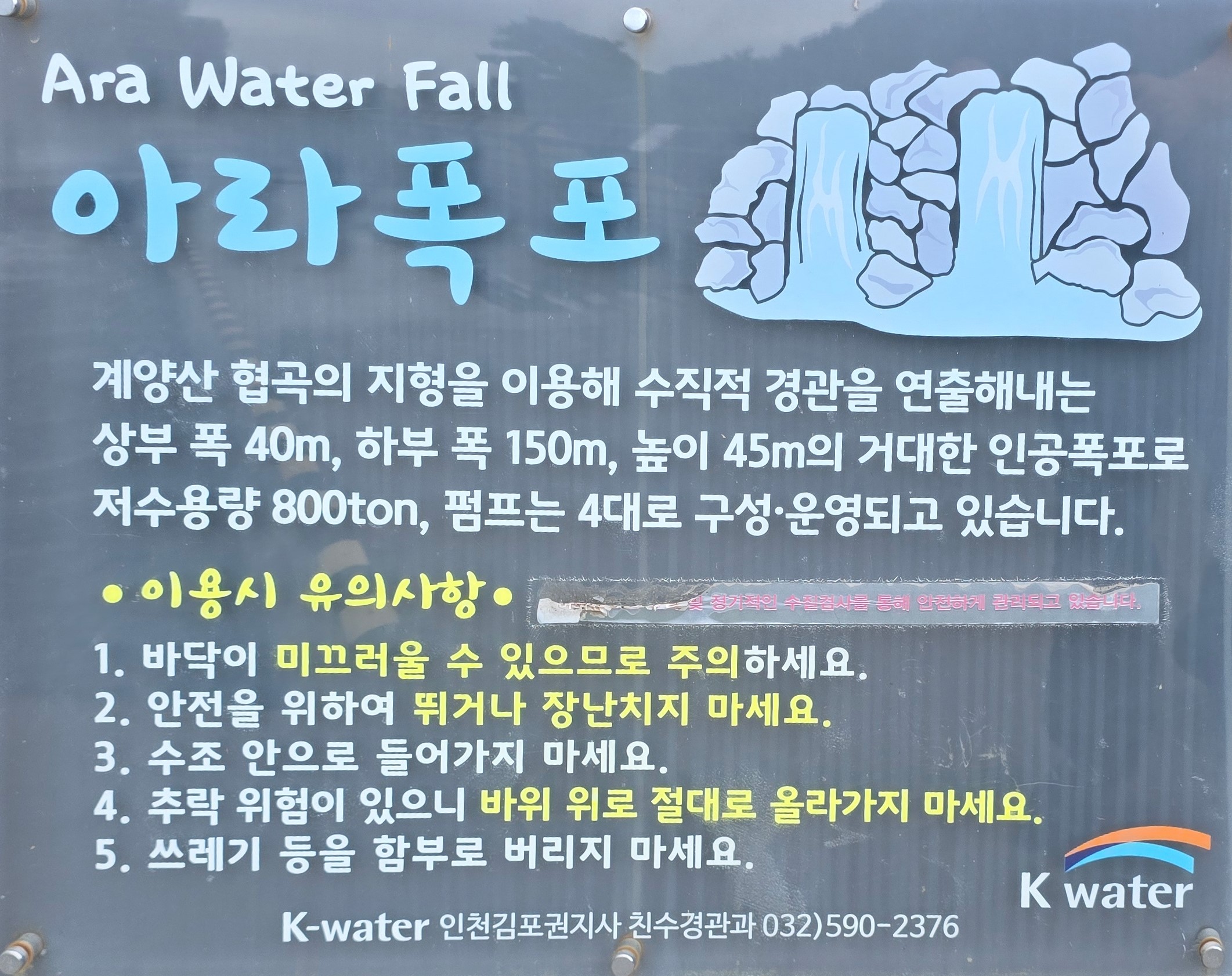 도심 속 자연과 함께 힐링할 수 있는 아라마루 휴게소 전망대에 있는 폭포는, 인천 지하철 1호선 계양역에서 버스로 약 20분 거리에 위치하고 있다.