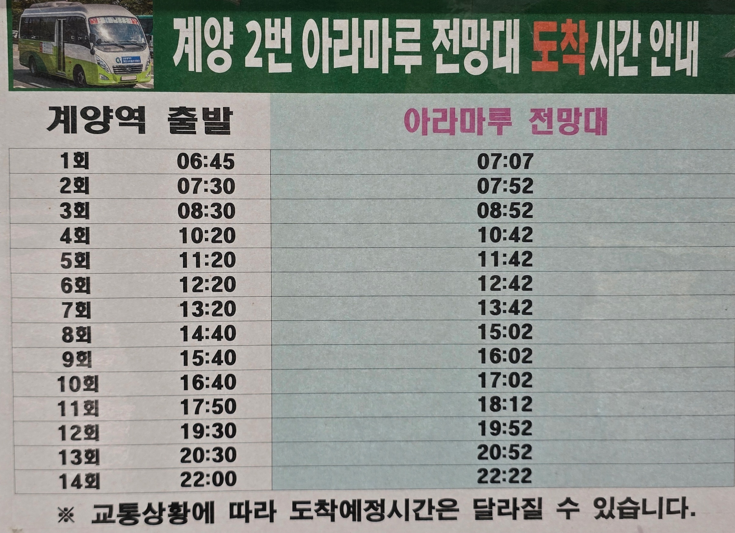 그리고 아라마루 전망대에서 계양역가는 마을 버스 계양2번은 07시07분,막차는 22시22분에 운행한다.