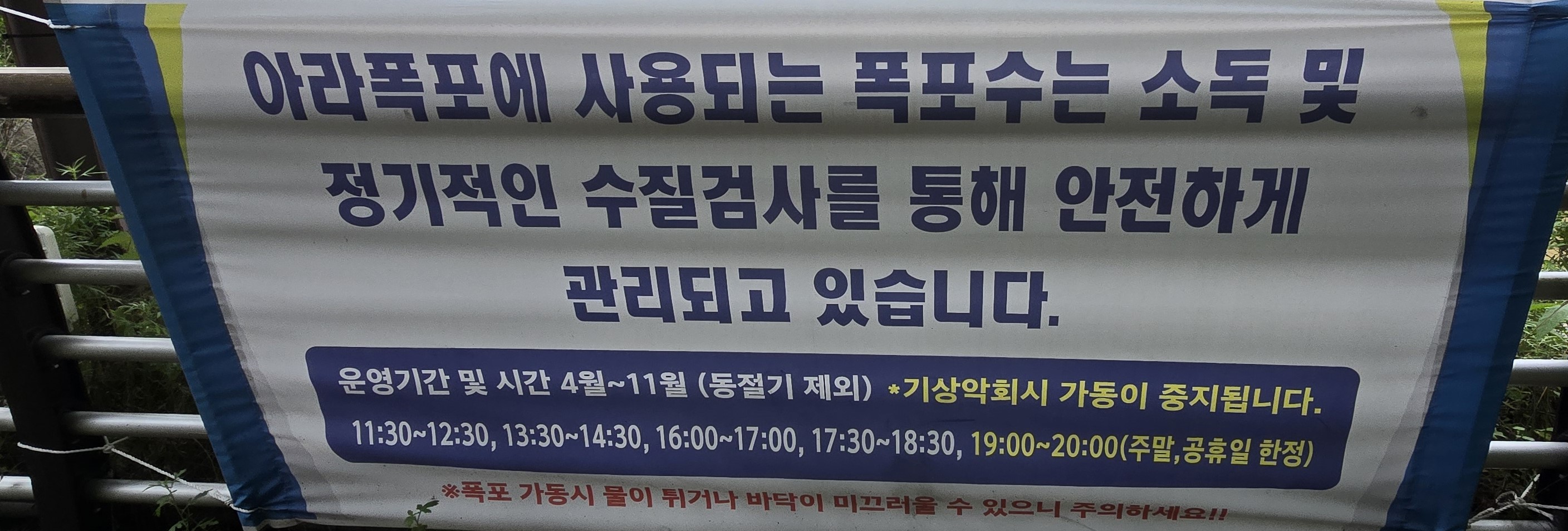 아라폭포는 카페가 있는 전망대에서 약 400m 이동하면 폭포를 장관을 감상할 수 있다.
