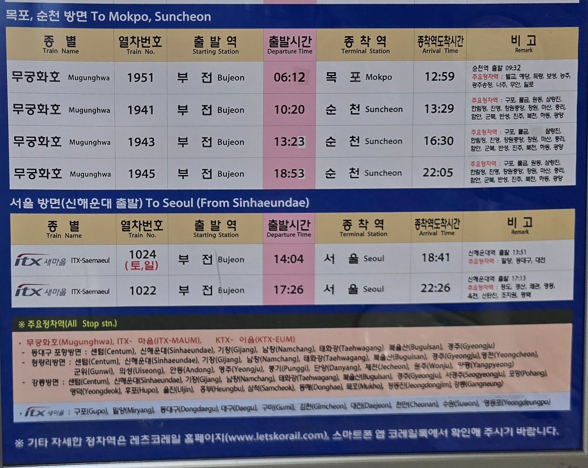 그리고 부전역에서 순천역까지 운행하는 무궁화호 열차는 06시12분,10시20분,13시23분,18시53분에 부전역을 출발하고,순천역까지 소요시간은 약 3시간 9분이 소요되고 요금은 12,400원이다.