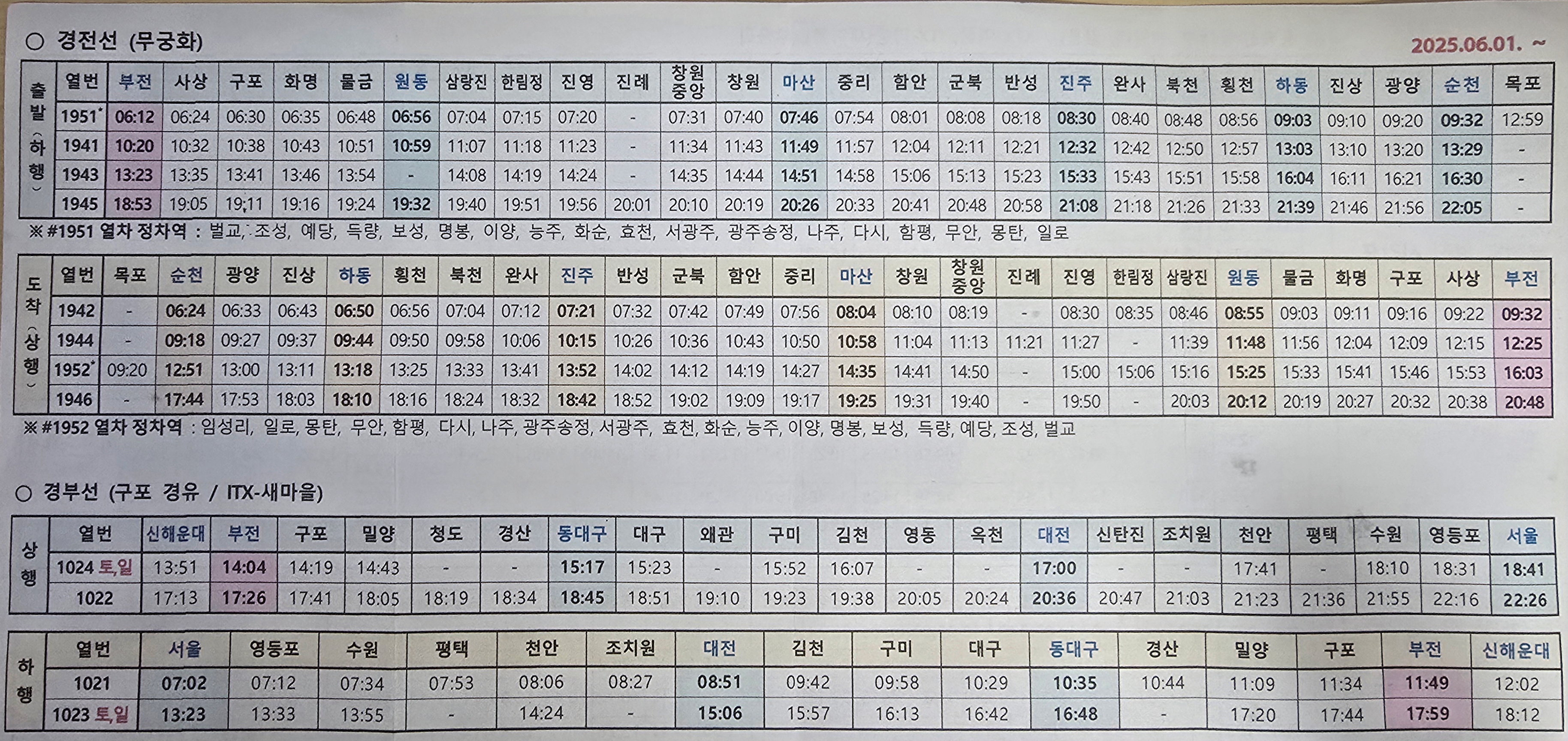 부전역의 기차 시간표는 2025년 6월1일 최종 변경되어 2025년 9월 6일 현재는 동일한 운행시간표로 열차가 운행하고 있다.