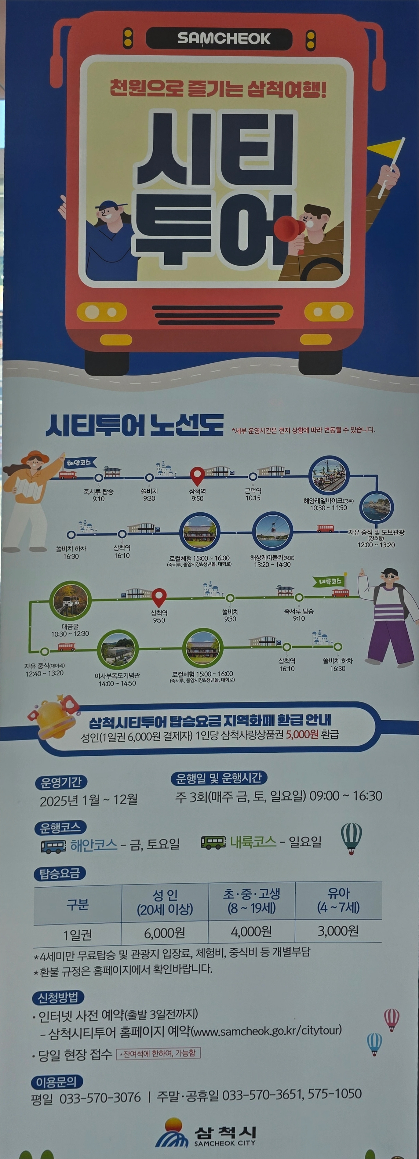 삼척역 앞에서 출발하는 시티투어 버스는 금토일에만 운행하는데 금,토일은 해안코스를 운행하고,일요일은 내륙코스를 운행한다.
