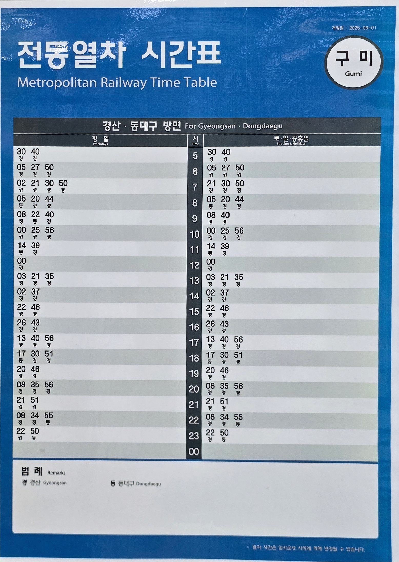 구미역에서 경산역가는 대경선 광역전철은 평일과 토일공휴일 모두 첫차가 05시30분에 운행하고,막차는 평일과 토일공휴일 모두 경산 방면은 00시22분,동대구방면은 00시50분에 운행한다.