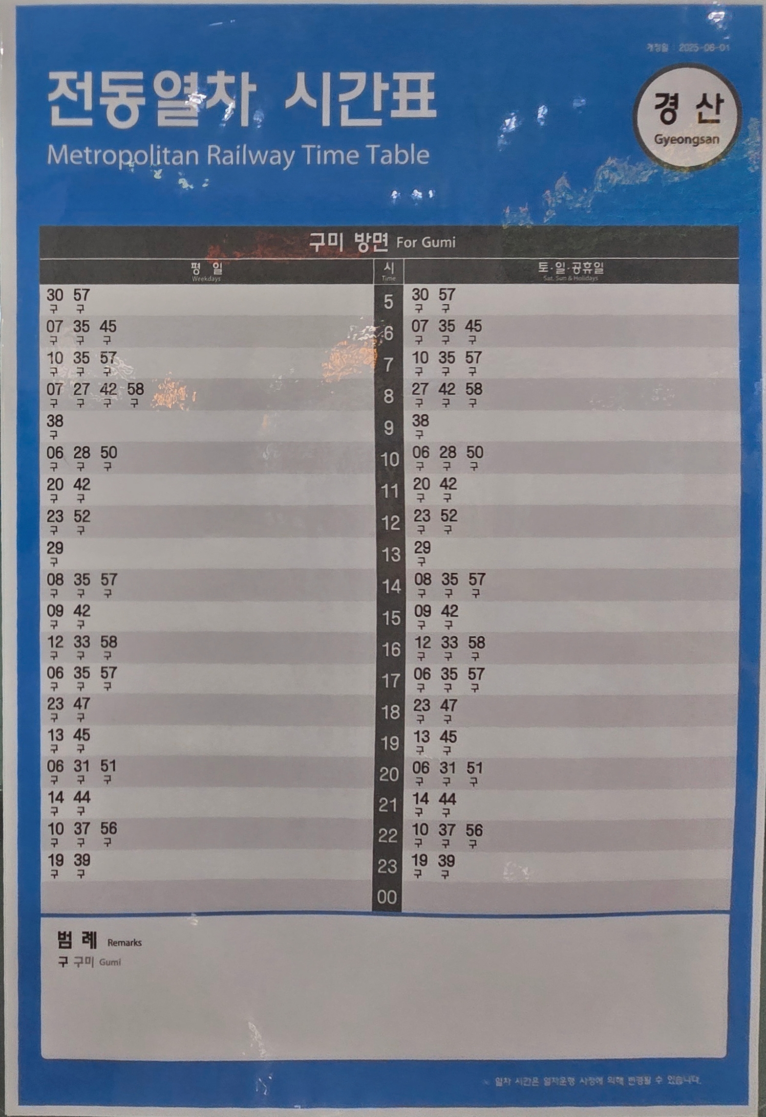 구미역의 열차 시간표는 2025년 6월 1일 최종시간표가 변경되어 2025년 9월 10일 현재는 동일한 시간표로 열차가 운행하고 있다.
