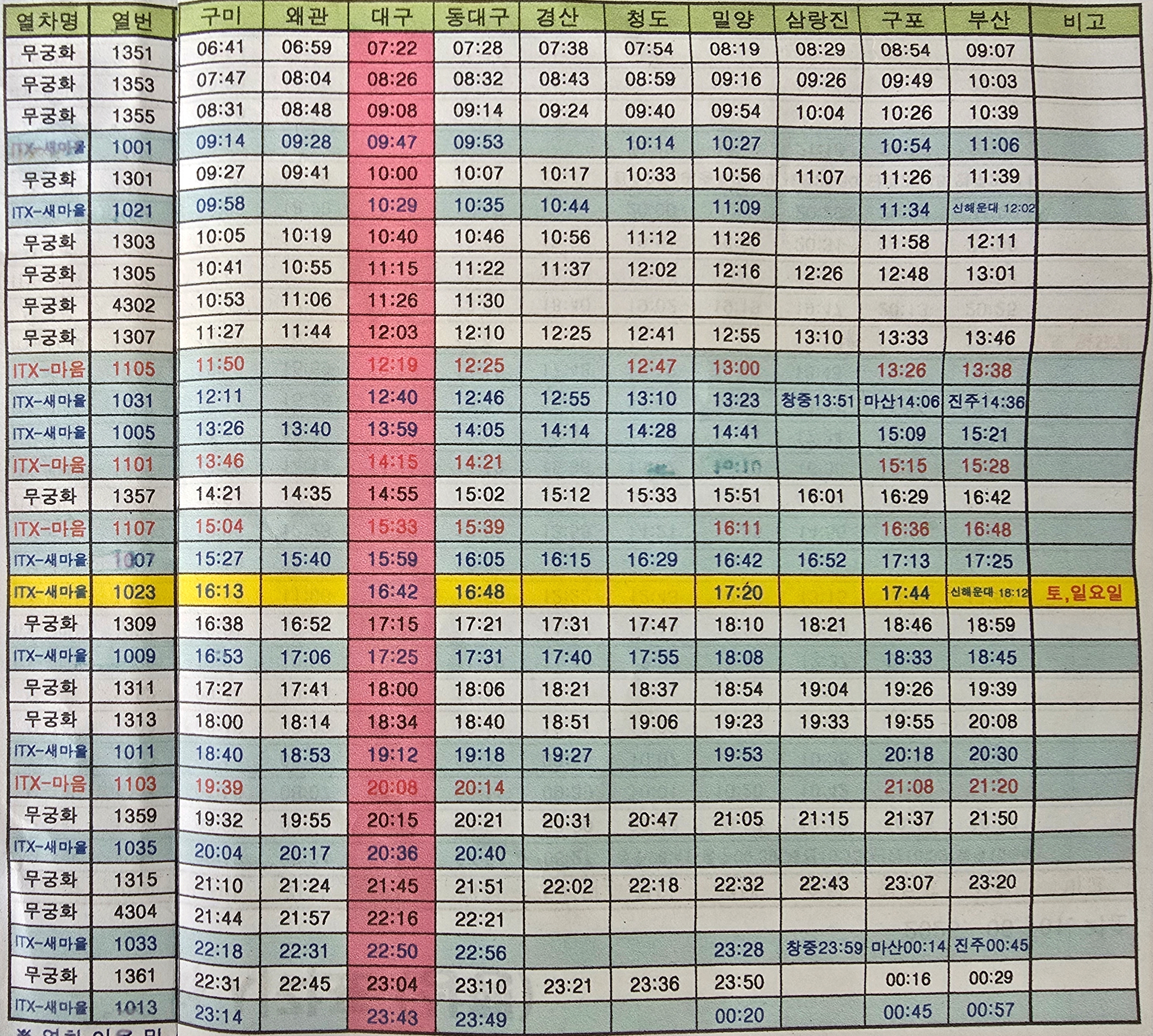 구미역에서 서울역가는 15시52분에 출발하는 ITX 새마을호 열차는 토일요일만 운행한다.