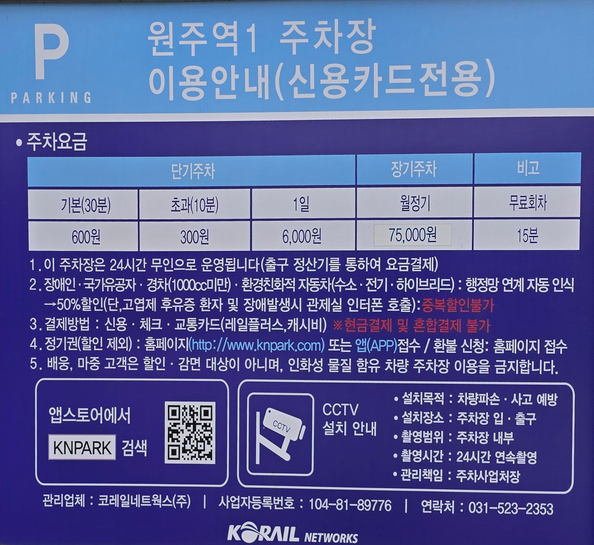 원주역 1 주차장은 무료회차는 15분이고 기본 요금이 30분에 600원이고 1일 최대 주차요금은 6,000원이다.